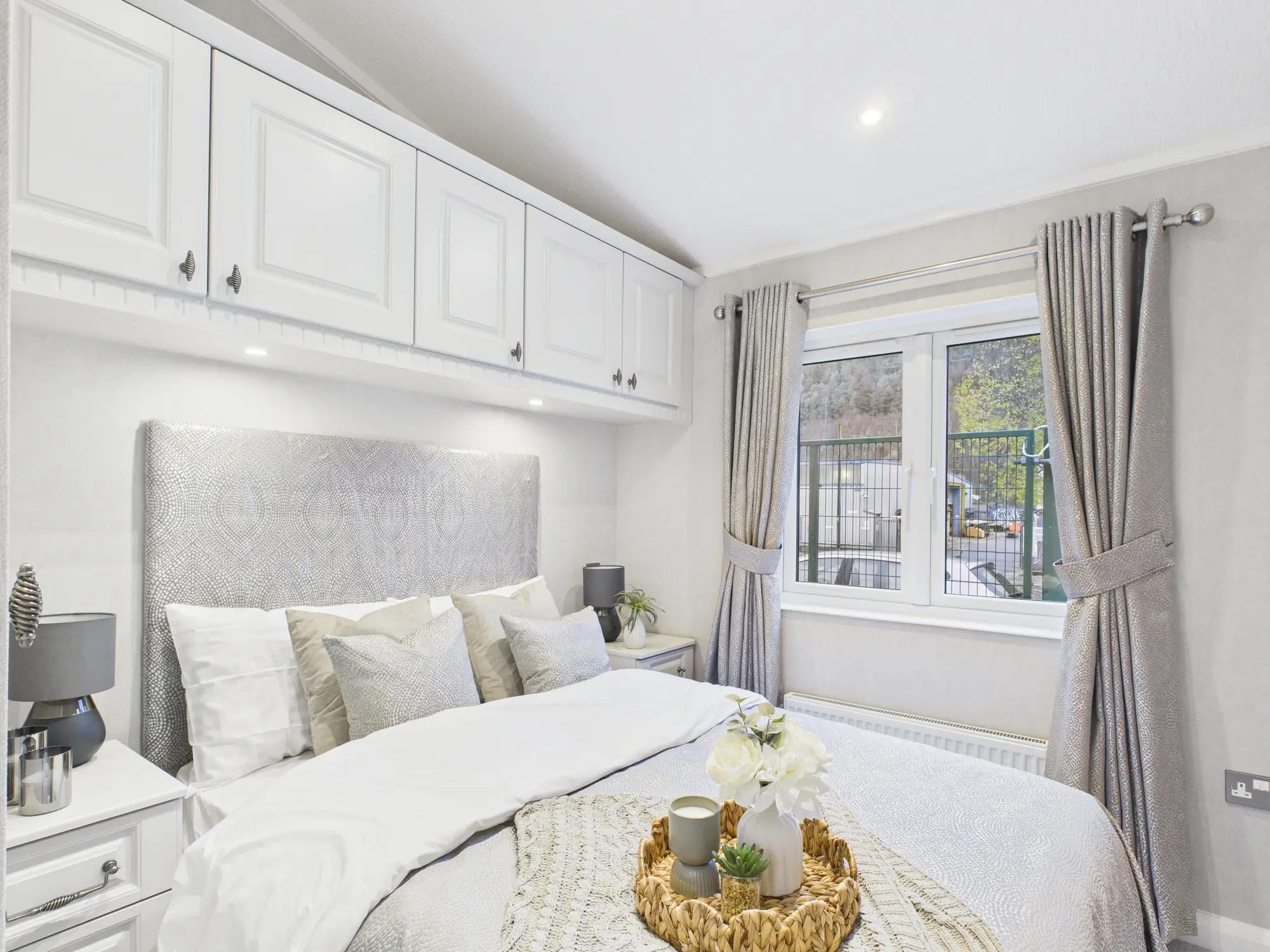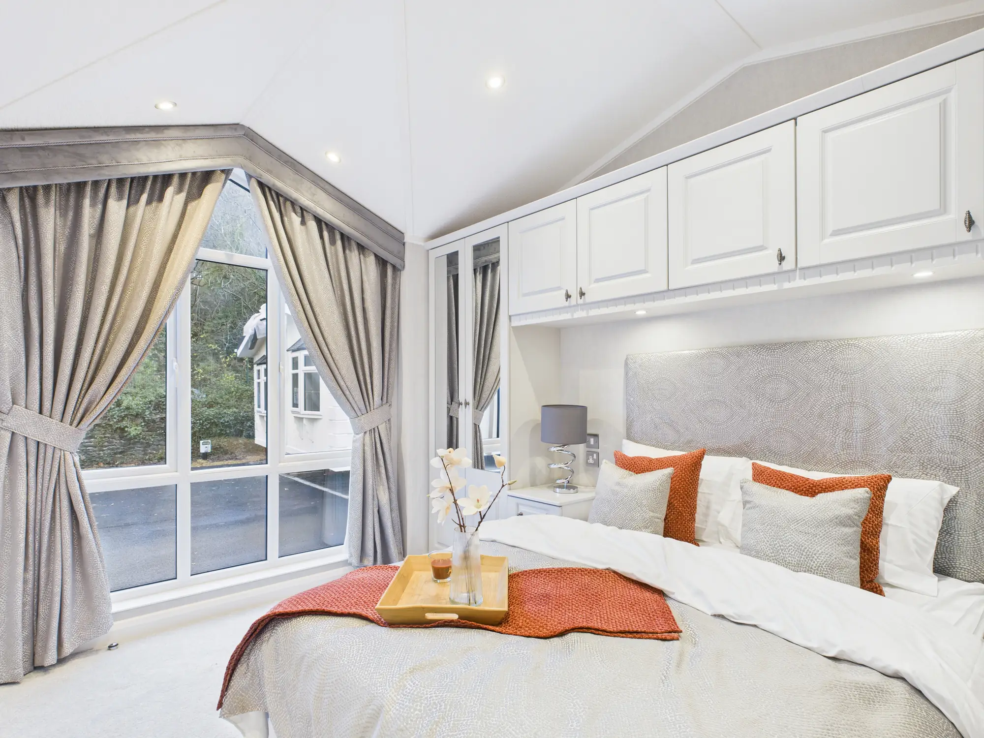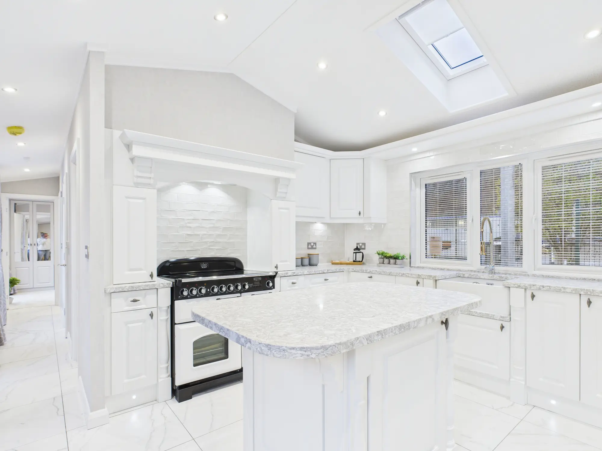 The kitchen itself is a standout feature, blending traditional character with modern convenience. Quartz worktops, tiled floors and walls, a statement range cooker with detailed mantle, Belfast sink and central island combine to create a space that is both functional and visually impressive. A glazed dresser unit provides an elegant display for glassware, while a roof window introduces even more natural light. The open and airy lounge benefits from expansive glazing and a feature electric fire with television provision above, forming a welcoming focal point. Bedrooms are carefully designed with generous built-in storage, including illuminated hatlocker cupboards, while the fully tiled bathroom offers a refined finish with a step-up bath featuring integrated LED lighting, a beautifully detailed vanity unit with illuminated shelving, and a heated towel radiator for everyday comfort.