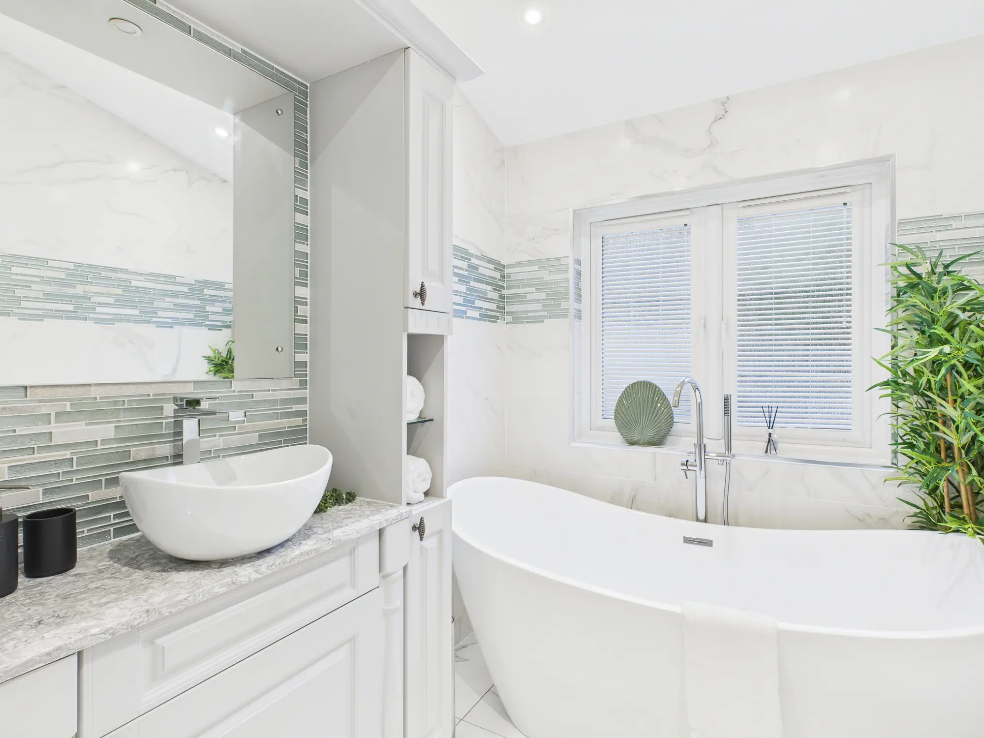 - Fully tiled bathroom with step-up bath and LED feature lighting