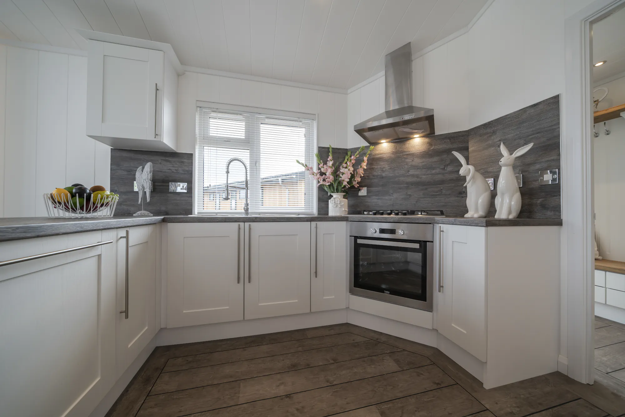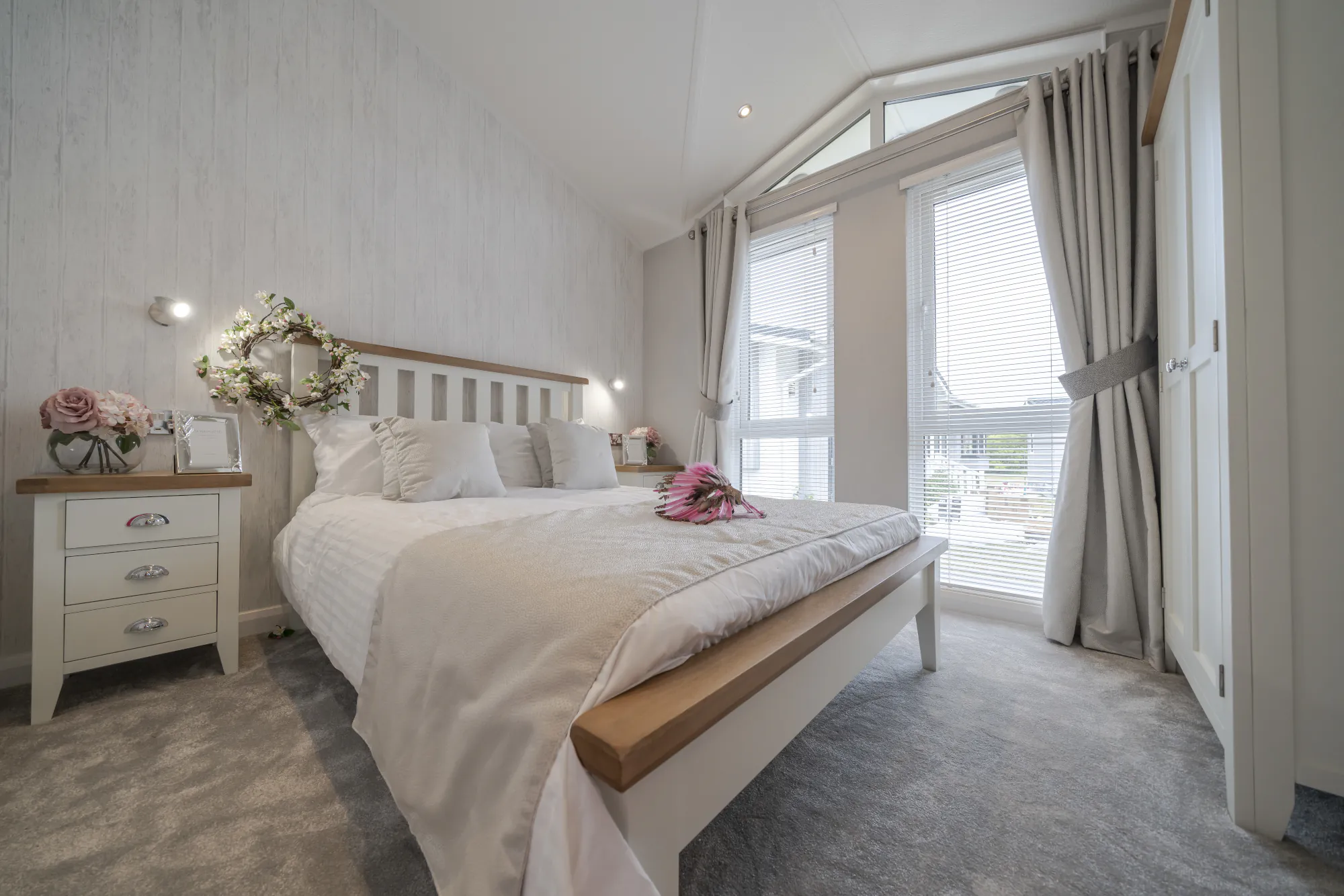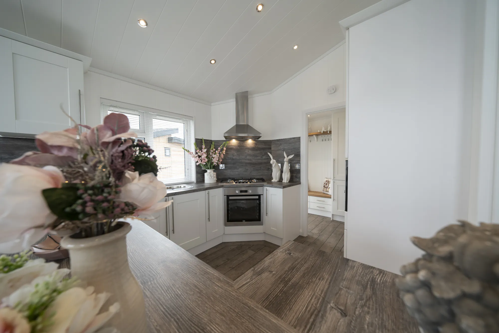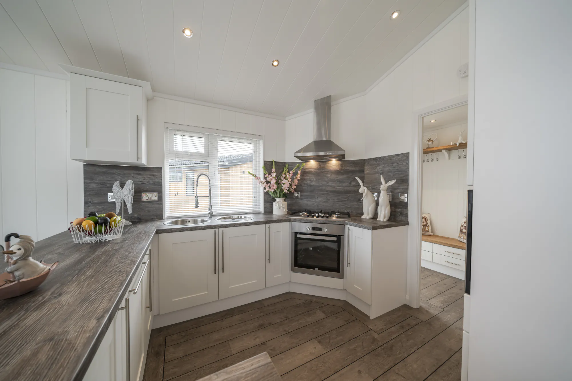 Practical touches complement its luxury feel throughout. The utility boot room provides handy storage and laundry facilities for busy holidays, while the bedrooms offer both comfort and refinement. The master suite, with its vaulted ceiling and glass gable, feels tranquil and spacious, complete with appropriate storage and a beautifully fully tiled ensuite shower room. The family bathroom is also fully tiled, complete with a shower over bath and modern vanity storage. A thoughtfully designed guest bedroom, featuring a walk-in wardrobe and ambient wall lighting, ensures guests feel equally at home. The Arundel is a lodge created for those who appreciate space, light, and a sense of easy elegance — a true retreat for premium holiday living.