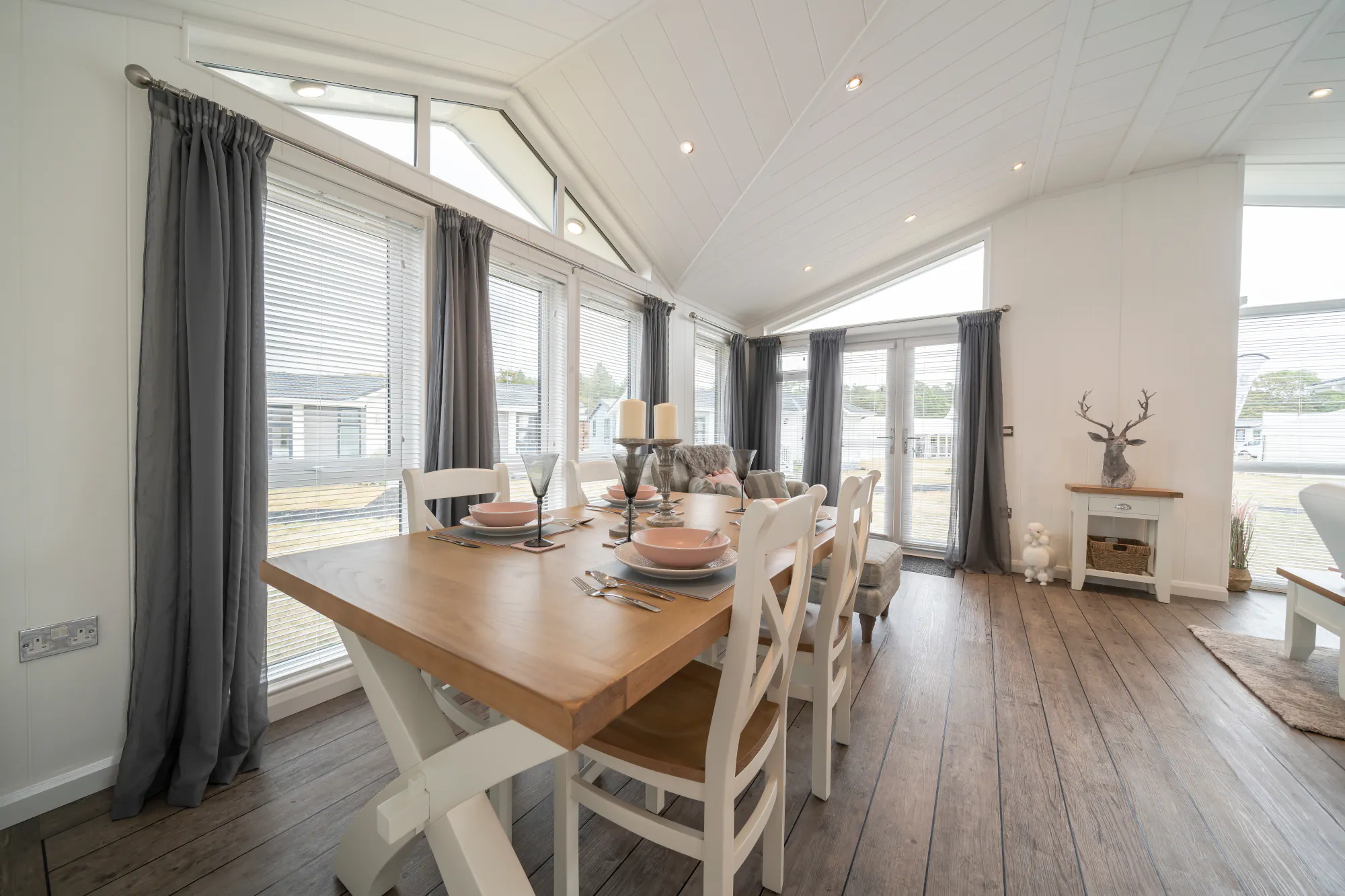 The Arundel is a striking holiday lodge that blends architectural flair with laid-back comfort. Its distinctive twin gables, triangular glass features, and tall bay frontage create an airy, light-filled aesthetic that perfectly frames its surroundings. French doors open onto the outdoors, making it ideal for relaxing mornings or summer evenings, while soft exterior lighting highlights its contemporary silhouette and invites you to unwind in style.