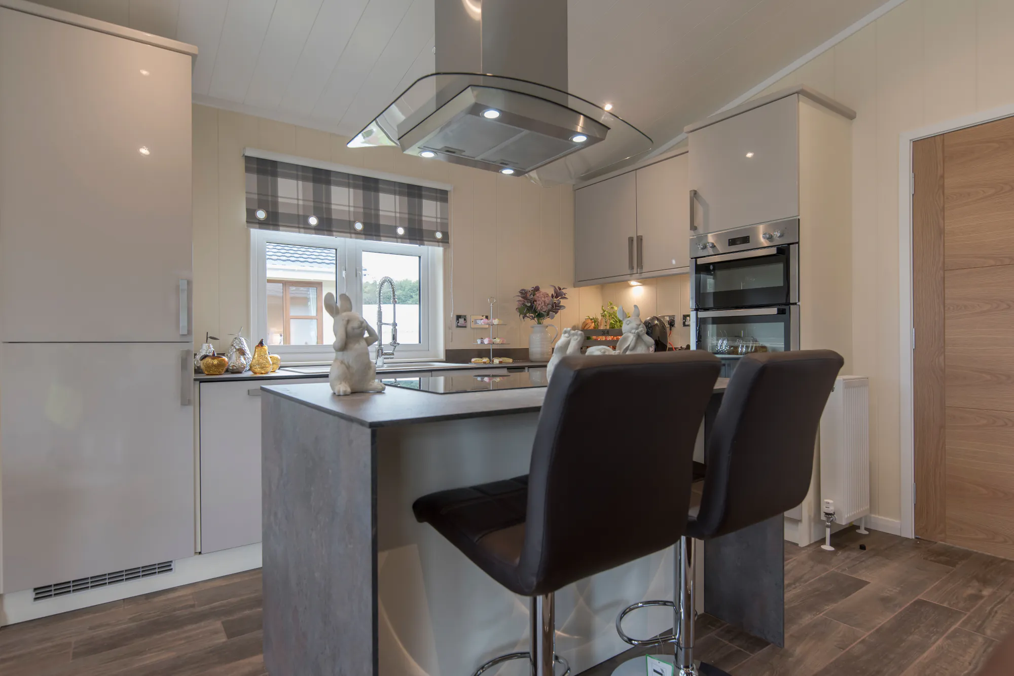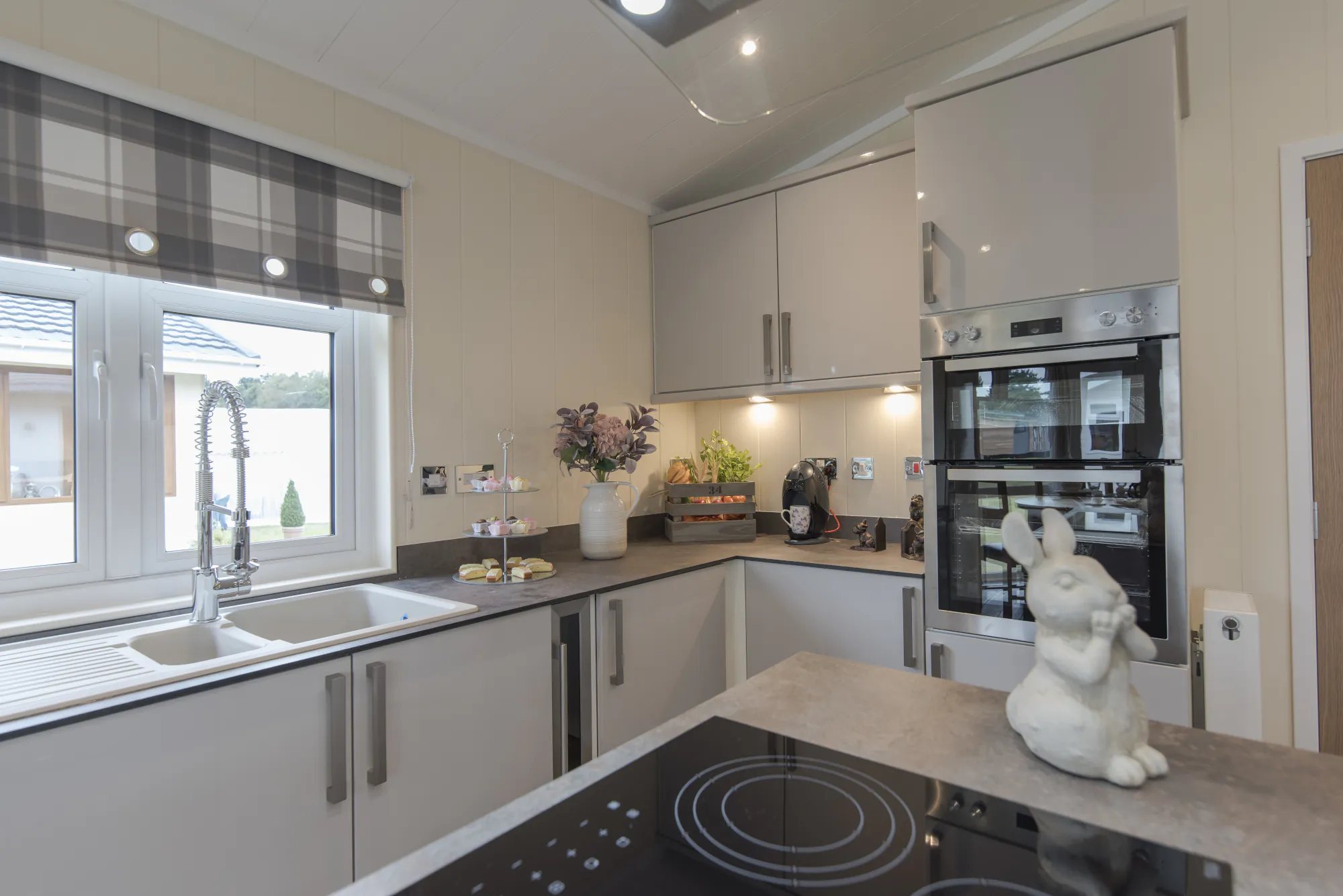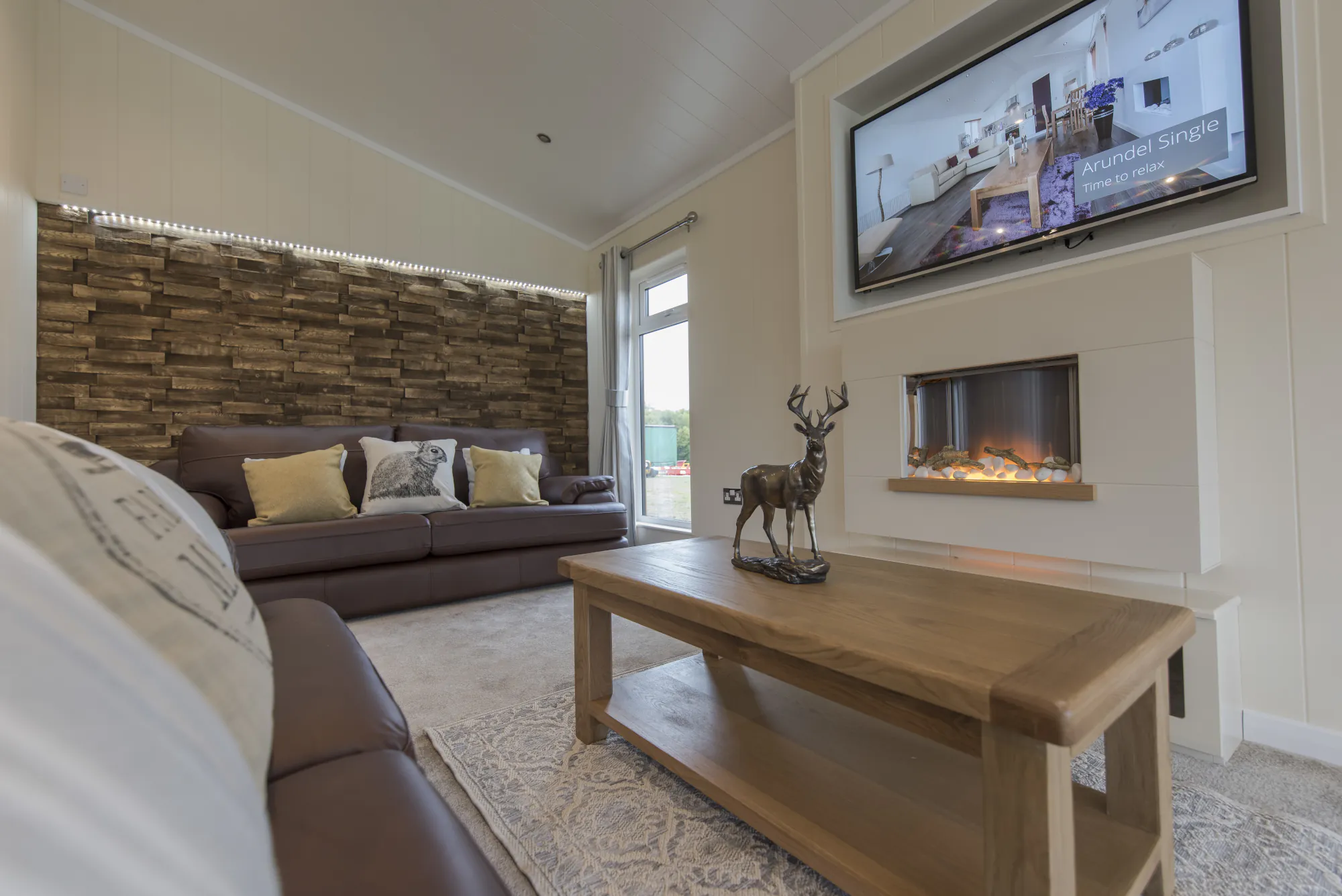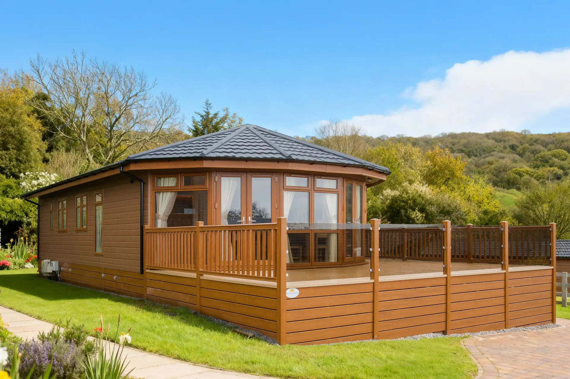 The charm continues throughout the bedrooms, where thoughtful design meets refined comfort. The master suite features a feature-clad headboard wall, built-in wardrobes with sliding doors, and a private en-suite shower room. Guests are equally well accommodated in the second bedroom, complete with coordinated furnishings and ample storage. A fully tiled family bathroom with a shower-over-bath and illuminated mirror cabinets adds a final touch of luxury. With its panoramic views, elegant finishes, and easy-living layout, the Harvard Lodge is the perfect retreat for memorable holidays with family and friends.