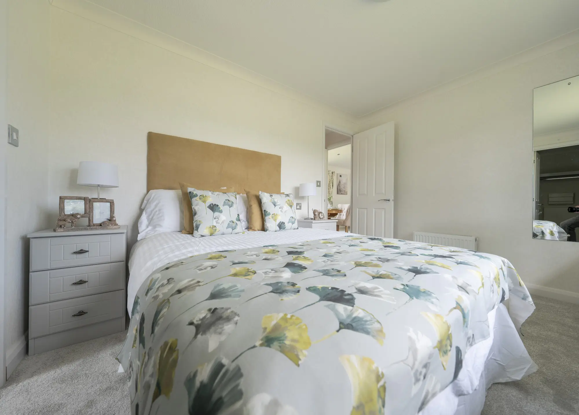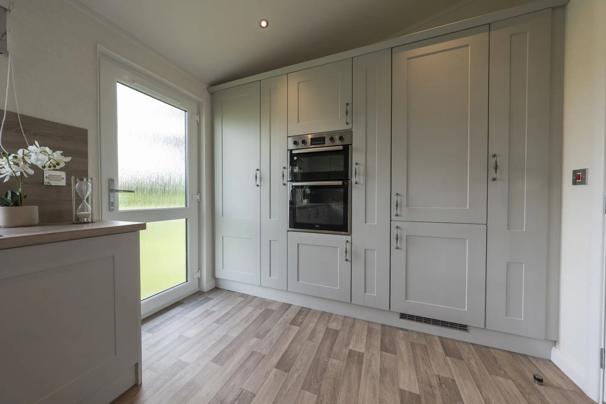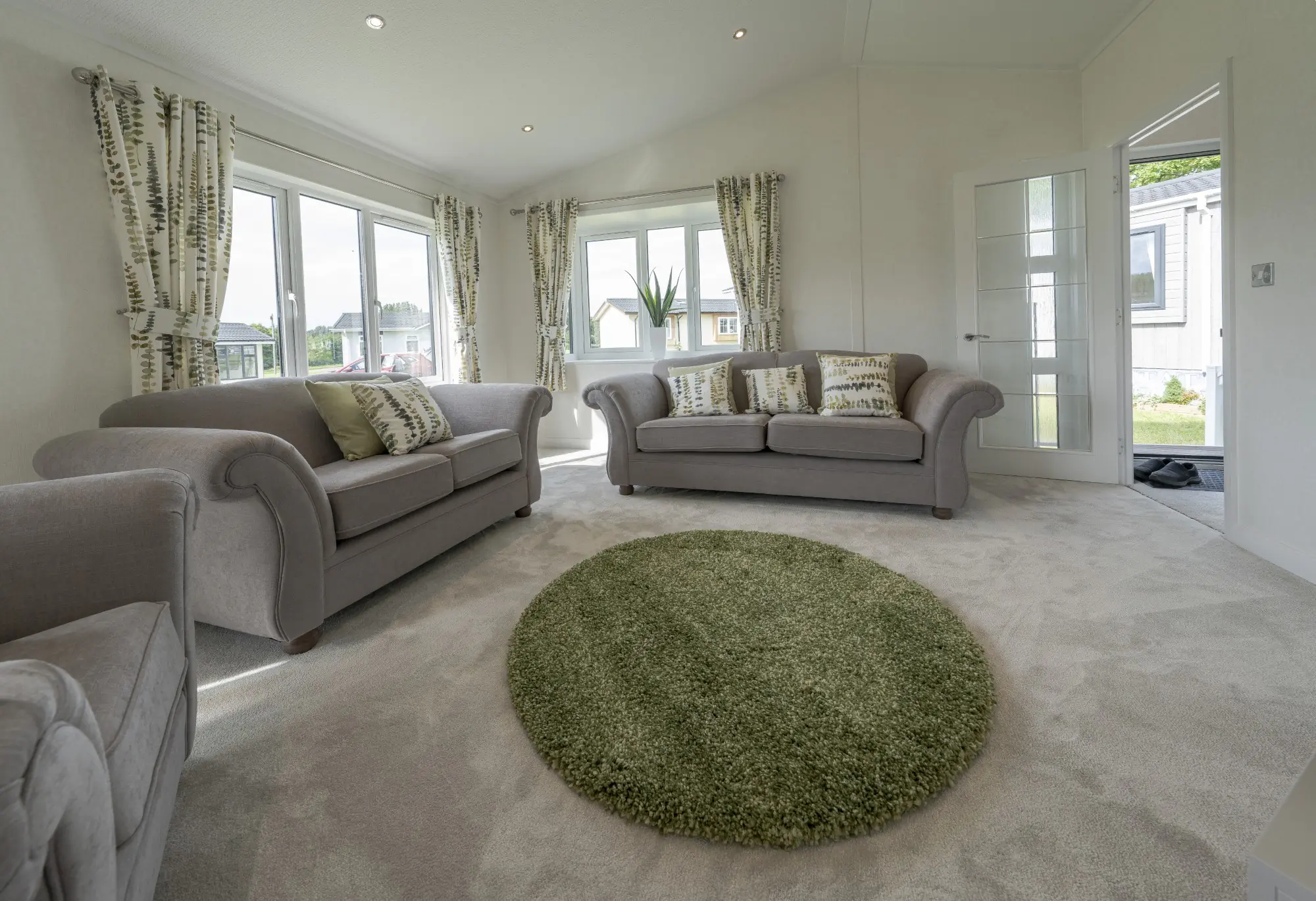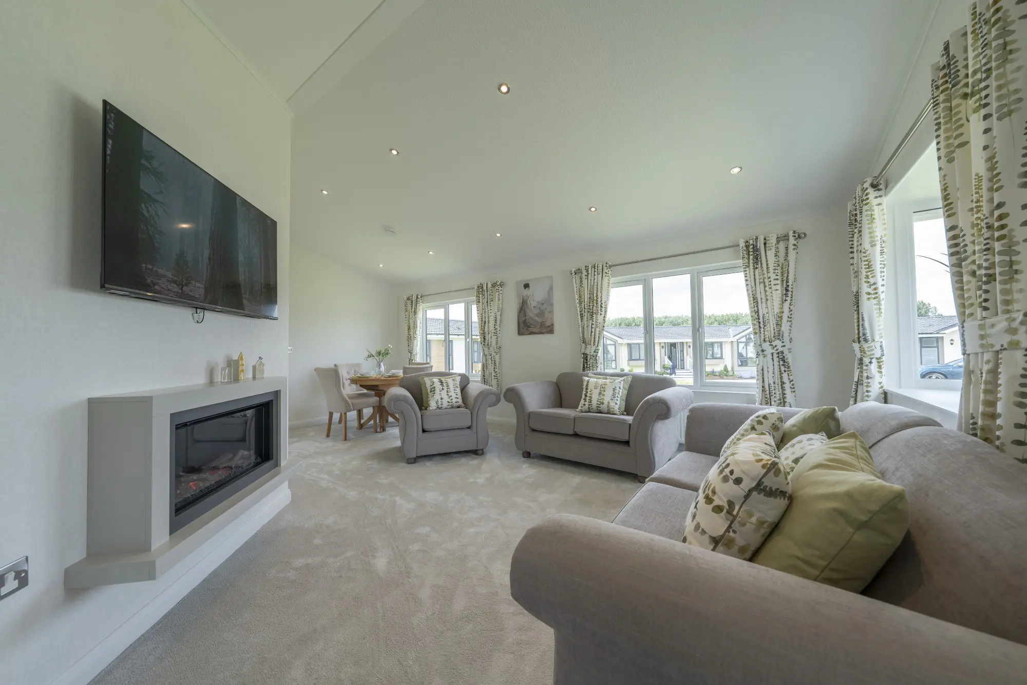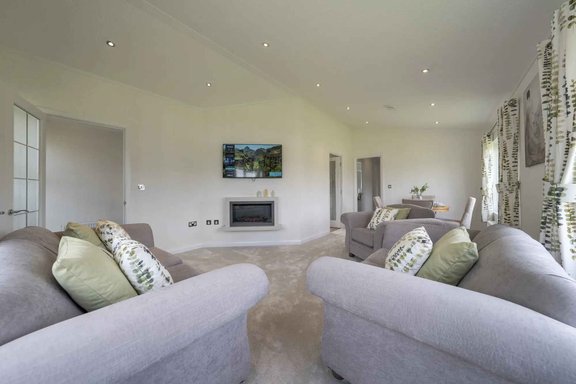 This contemporary park home combines modern design with practical comfort. The front entrance opens into a welcoming hallway with a generous cloak cupboard before leading into a bright, open-plan living area. Vaulted ceilings across the lounge, dining space, and kitchen enhance the sense of space and light, creating a relaxed environment for everyday living.