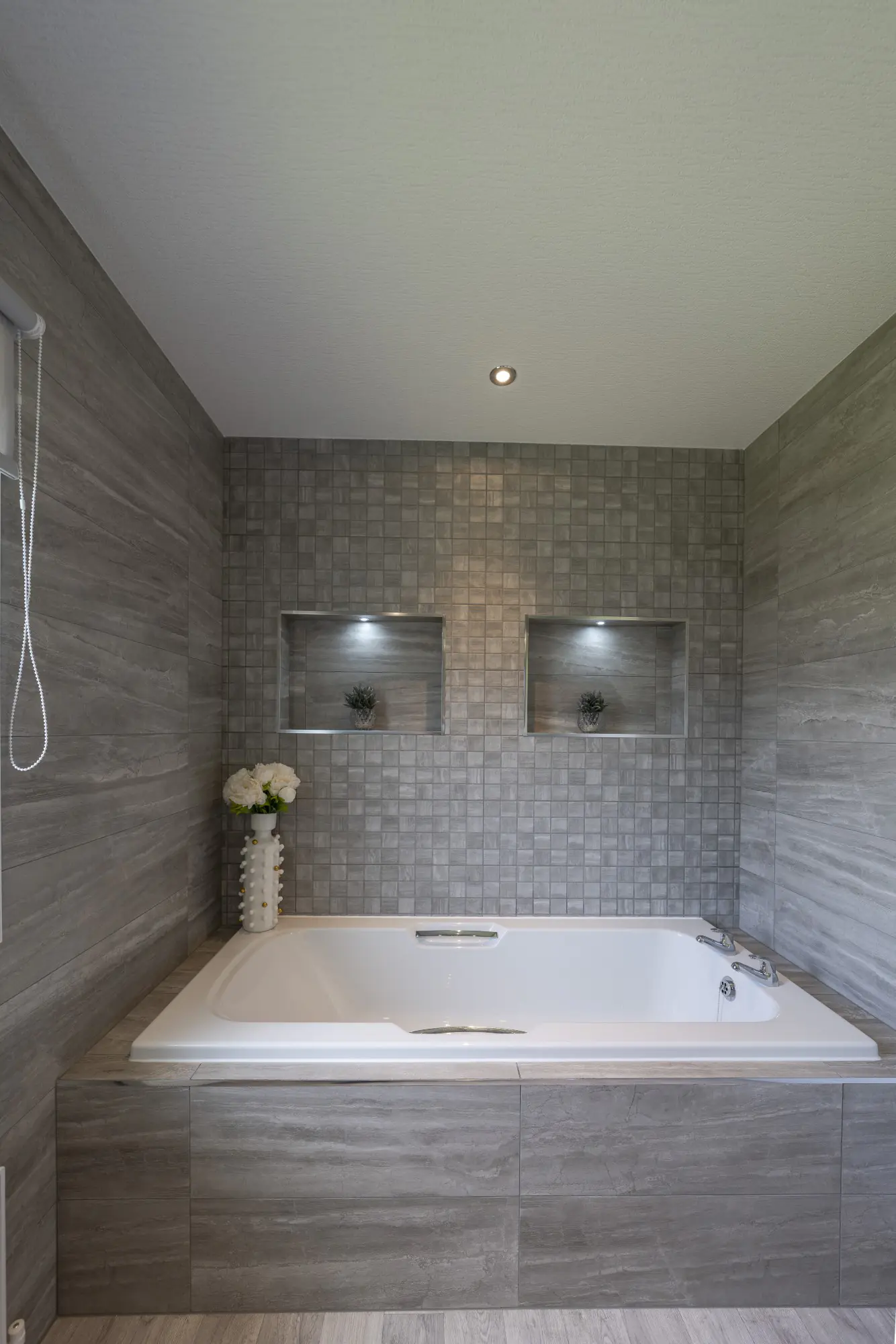 - Bathroom with tiled walls, built‑in bath, modern illumination, and generous storage