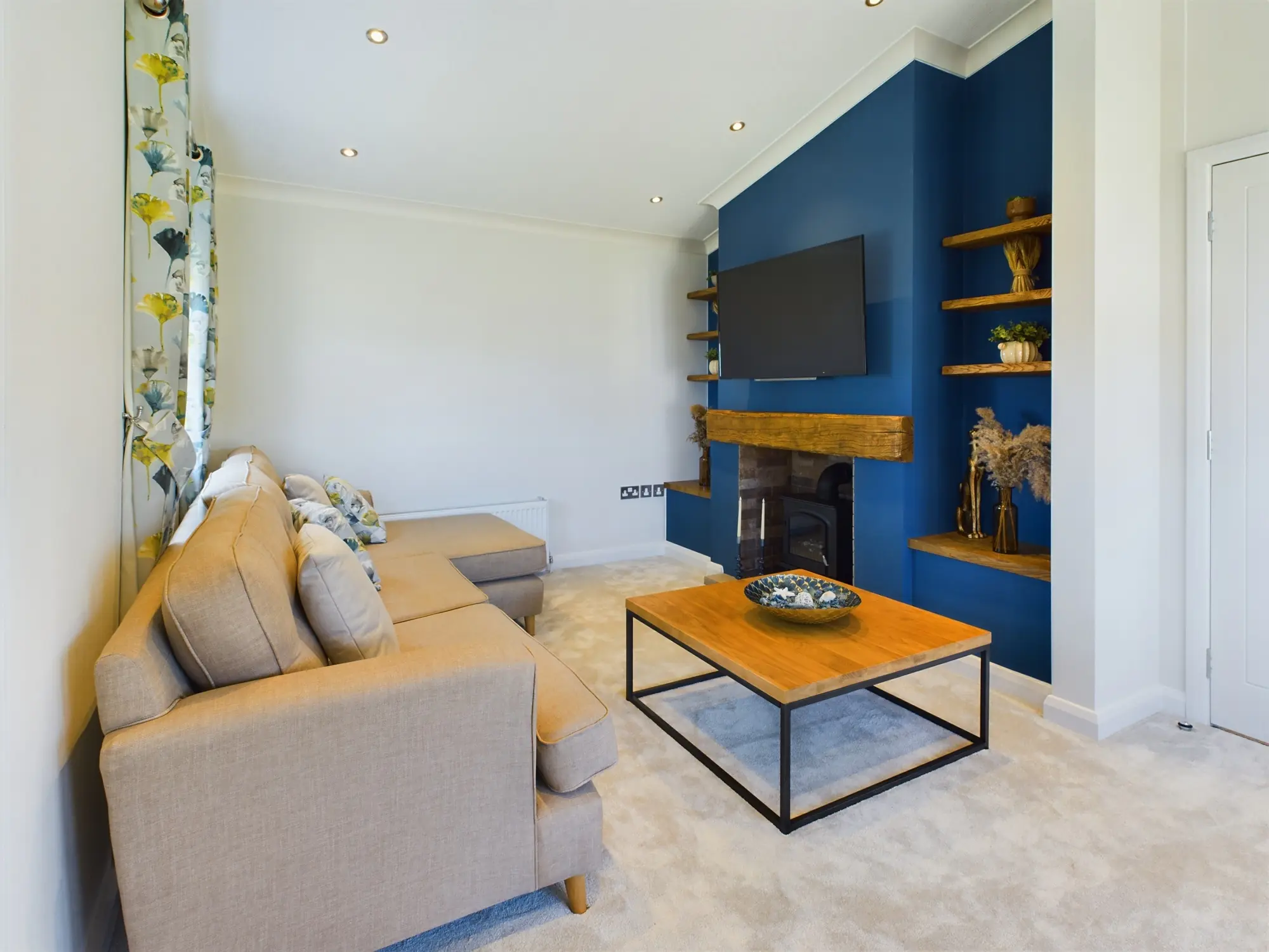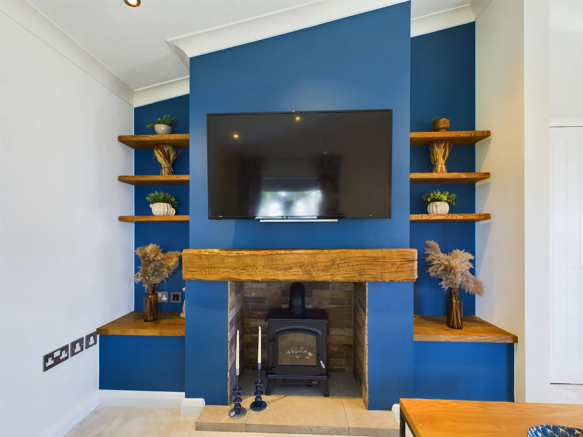 - Lounge fireplace wall with real‑oak features, tiled hearth and electric stove