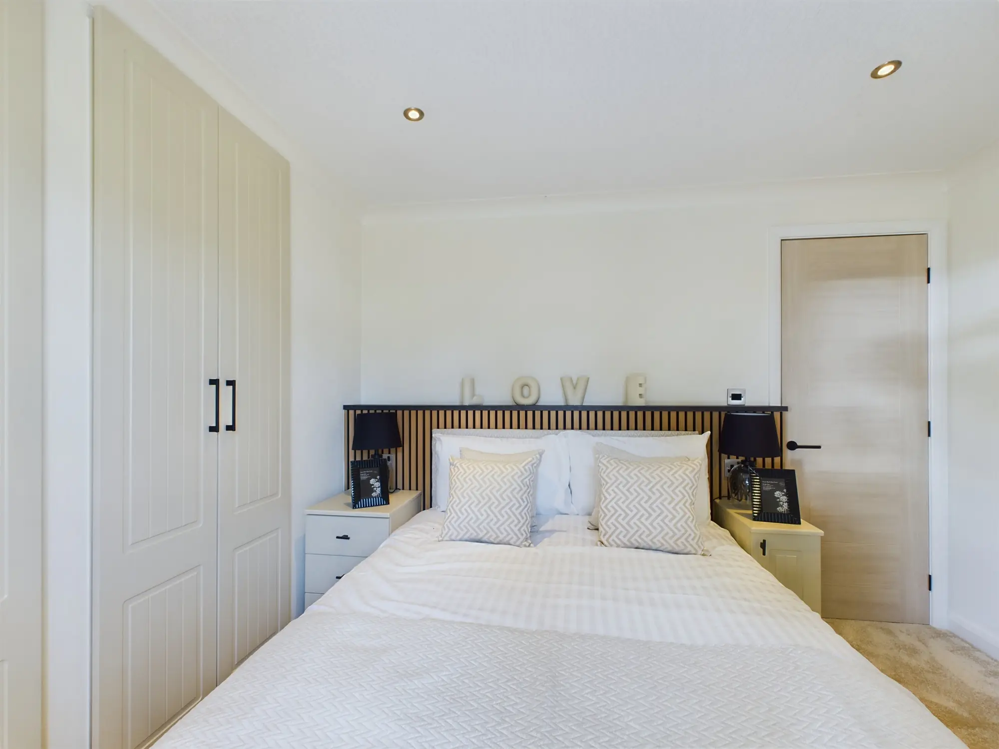 - Master bedroom with slatted feature headboard and fitted furniture